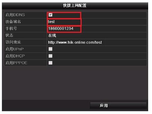 勾選啟用DDNS,設置設備域名(自定義,只支持小寫字母、數字以及“—”且必須以小寫字母開頭,必填),手機號碼(后續增值服務使用,必填)。當設備狀態顯示在線時可以使用自動生成的訪問地址來訪問設備。