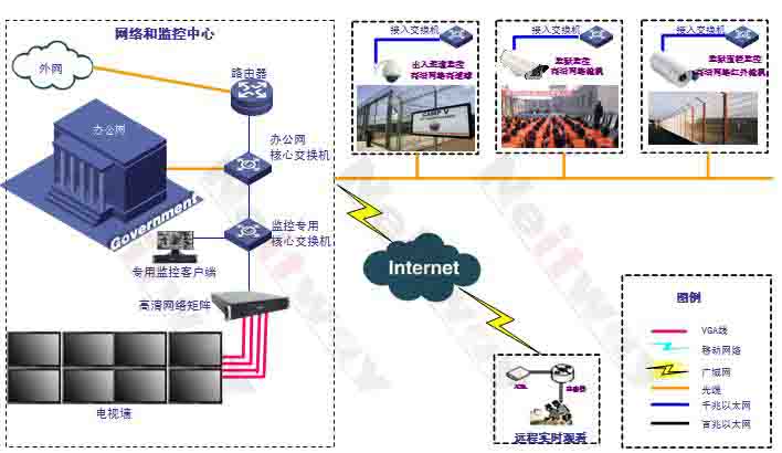 采用網絡化的高清視頻監控技術,就可以解決模擬監控存在的以上問題,大大提高監控效率和管理水平,同時也大大提高了監控系統整體投資的經濟性。我們假設監獄內部已經鋪設了數字化的光纖傳輸網絡,在各監控點可以提供10/100/1000M的以太網接口,同時各監獄到上級監獄管理局也有專門的數據傳輸線路,主要的投資也就集中在前端攝像機與后端顯示控制部分。Neitway高清網絡視頻監控系統,包含高清網絡矩陣,高清網絡攝像機及綜合監控管理平臺軟件,可以為用戶提供一整套IP高清視頻監控解決方案。